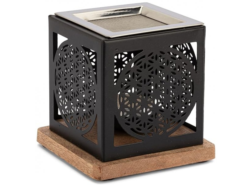 Nápaditá kovová kadidelnice se čtvercovým sítem a ornamentovým vzorem posvátného symbolu Květu života s kouzelným světelným efektem. Dokonale
